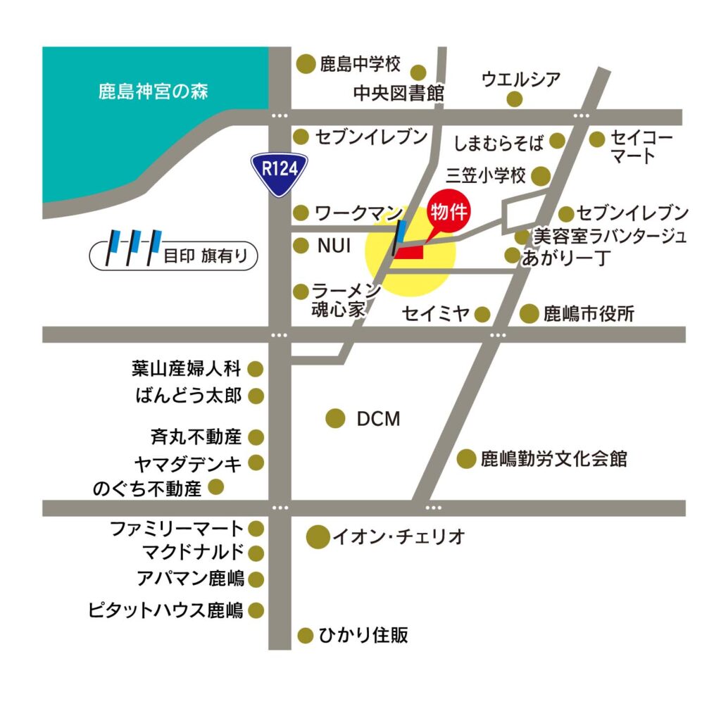 鹿嶋市役所(500m)、イオン・チェリオ(1000m)、DCM鹿嶋店(600m)、鹿嶋勤労会館(800m)