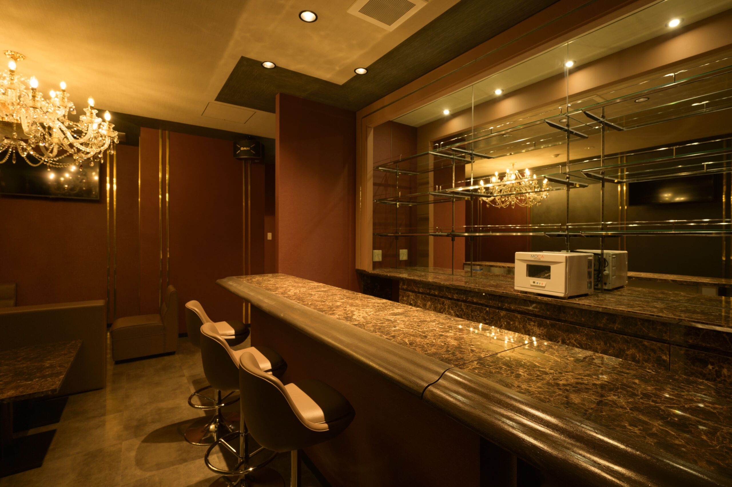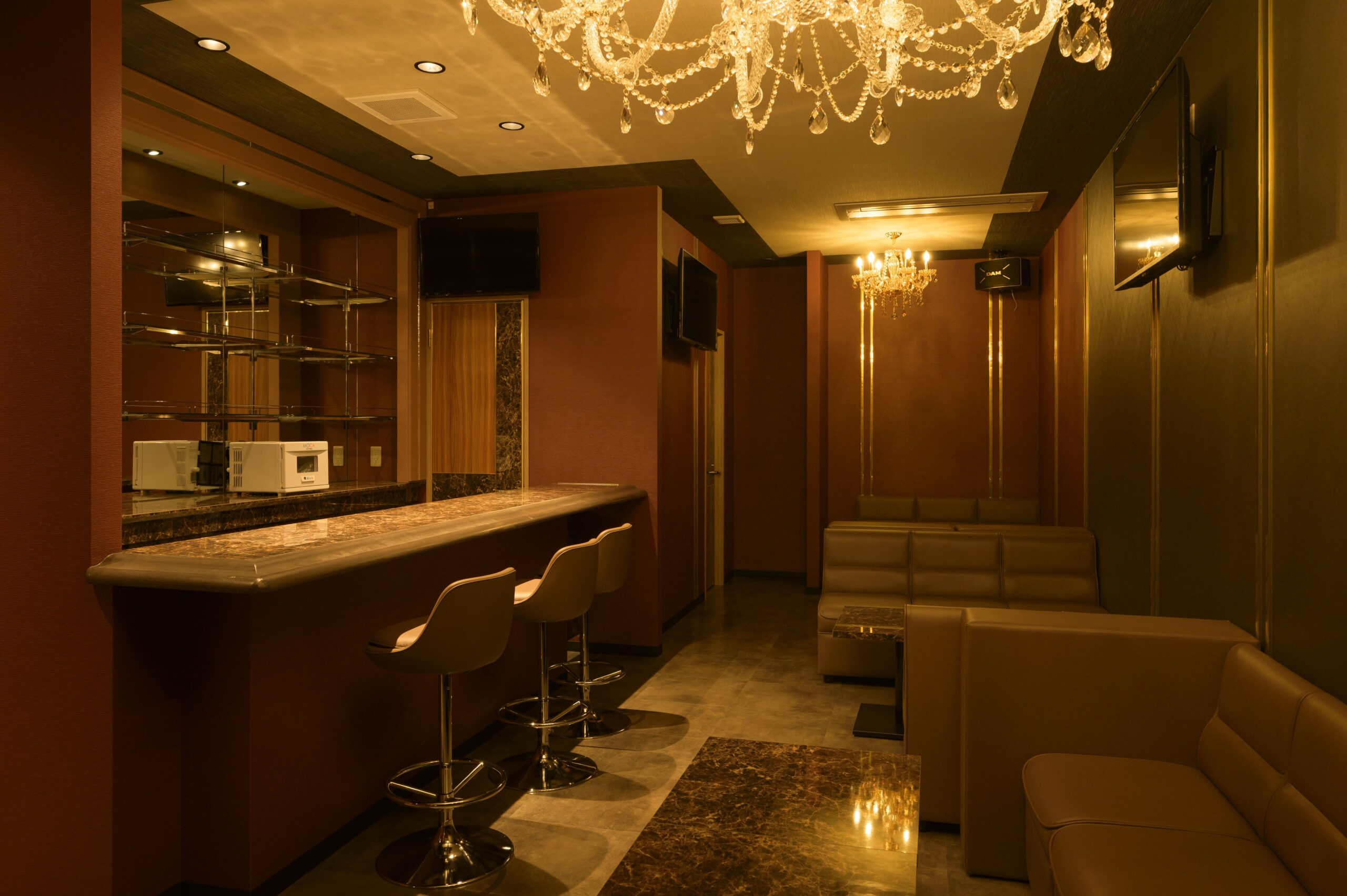 | 設備・条件 | ガスコンロ 冷蔵庫 エアコン プロパンガス 公営水道 排水下水 駐車場有 家具・家電付 ボックス14席(キャロル)+接客用5席=計19席、コーナー1席、スツール2席、カウンター3席、肘置×1、衝立×2、モニター42型3台32型1台、冷蔵庫、電子レンジ、タオル冷温機 |
