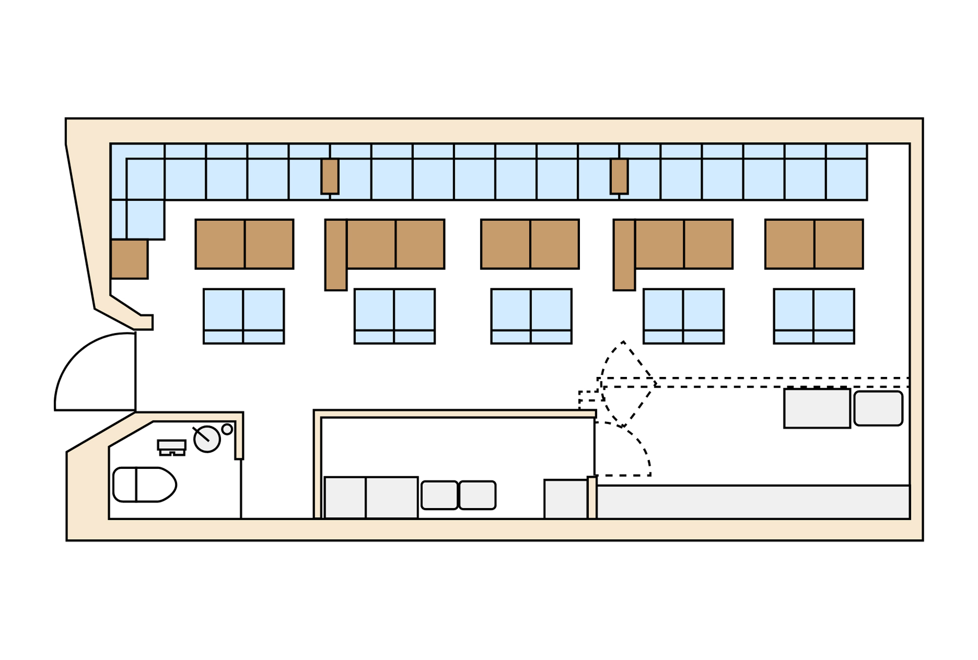 ボックス18席(メリル)+接客用10席=計28席、コーナー1席、スツール2席、カウンター3席、肘置×2、衝立×2、モニター42型3台32型1台、ハンガーラック